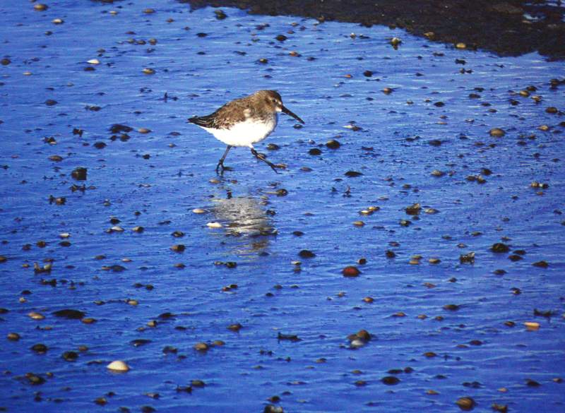 So ist auch die Gegenwart des Unendlichen Gegenstand der großformatigen Fotografien, die bestimmt sind von der Weite des Horizontes. „Die Horizontlinie ist etwas Wundervolles“, sagte Eva Maria Koch. Angetan habe ihr das Rote Kliff von Sylt, das sie meist von oben fotografierte, oder die Steilküste von Rügen. Norderney ist ihr stiller Favorit, wenn sie mit dem großen Spiegel im Bollerwagen und ihrem Hund unterwegs ist. Manche Aufnahmen zeugen von harter Arbeit, manches Missgeschick eröffnet ungeahnte Möglichkeiten künstlerischer Freiheit. Wenn dann das Gegenlicht, geblendet durch den Spiegel, die hellsten Stellen freigibt, kann es schon einmal zu ihrem Lieblingswerk werden, wie die zurückgeworfenen Grashalme auf Norderney. Anrührend auch die Gute-Laune-Aufnahme von dem „Knutt“, dem Alpenstrandläufer, der im leuchtenden Blau des Muschelsaumes daher schreitet.