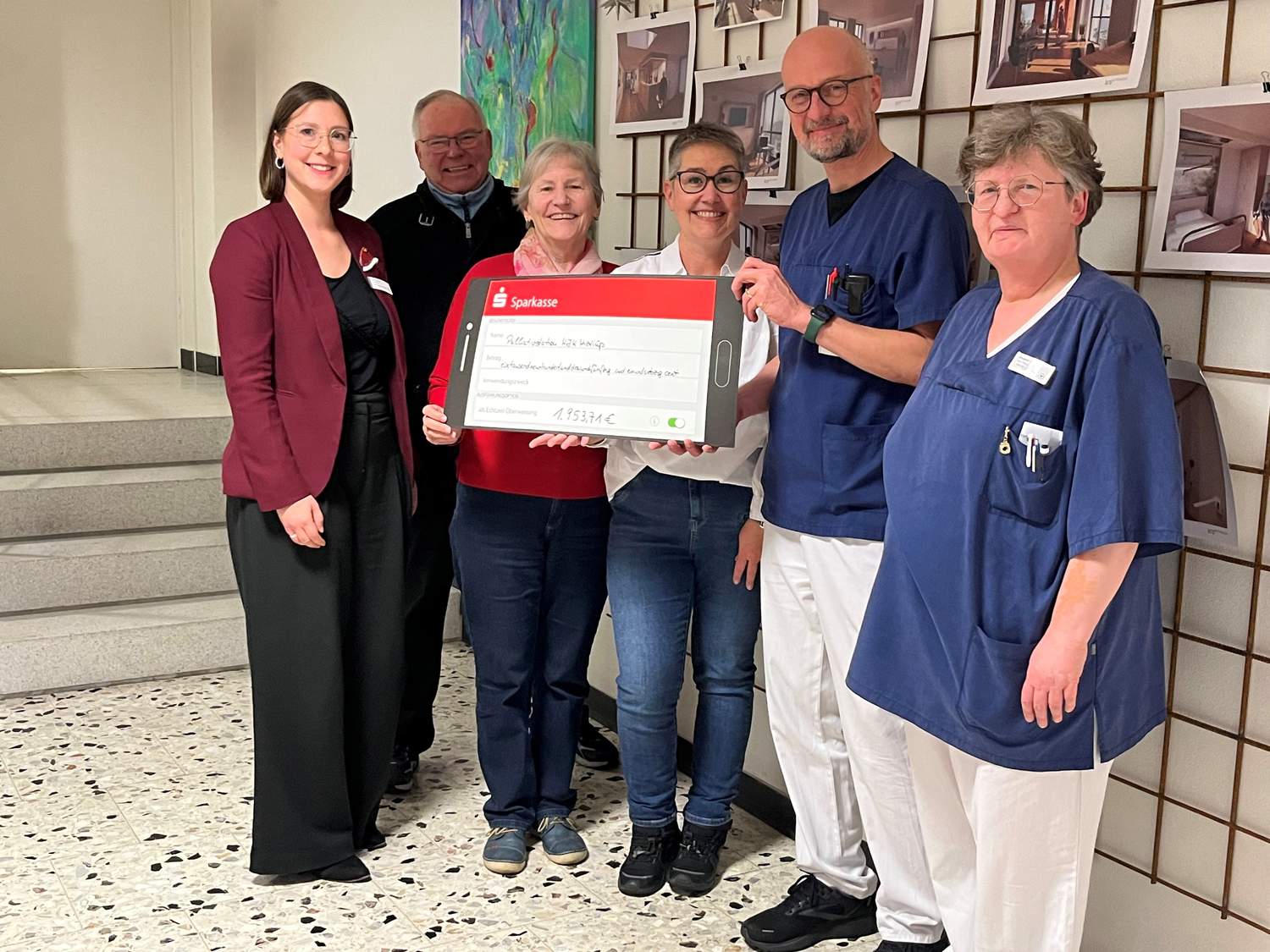 Die Spende wurde von Nicole Buhr, Margarete Schulenkorf-Wiebusch und Karl Franke an unser Haus übergeben. Im Anschluss hatten Dr. Jürgen Dirks, Laura Zupanc und Elisabeth Kempes die Gelegenheit, die neuen Zimmer der Palliativstation im Neubau der vierten Etage zu präsentieren. Die Zimmer befinden sich aktuell noch im Bau und werden voraussichtlich am 6. Februar eröffnet.